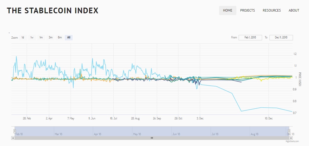 Stablecoin Index also has a graph on its frontage that shows the price movements of stablecoins since Feb. 1, 2018. The most volatile of the bunch – the only volatile stablecoin if the standards of the regular cryptocurrency markets are applied – has been bitusd. The crypto reached its high of $1.19 in the beginning of the examined period and is currently trading at its lowest price this year, $0.72.