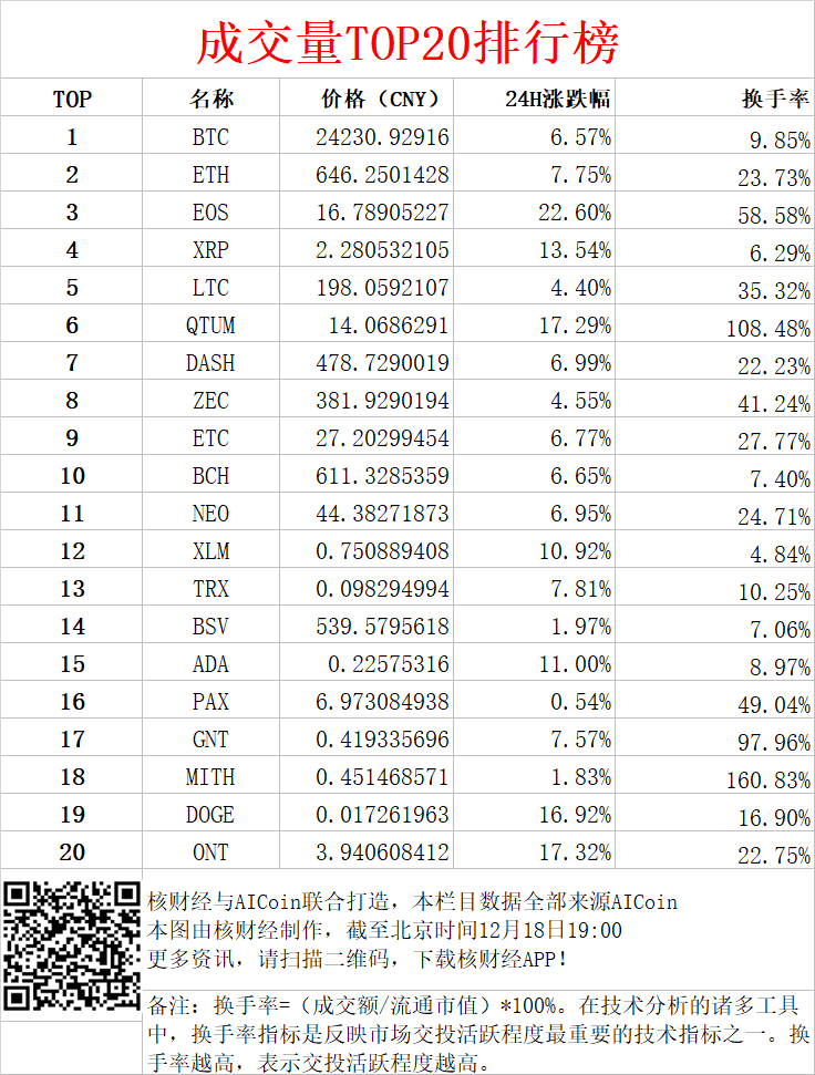 3、交易量TOP20币种:换手率介于15%-35%(属于温和放量)的币种有:ETH、DASH、ETC、NEO、DOGE、ONT;换手率超过35%(属于异常放量,被控盘概率较高)的币种有:EOS、LTC、QTUM、ZEC、PAX、GNT、MITH。