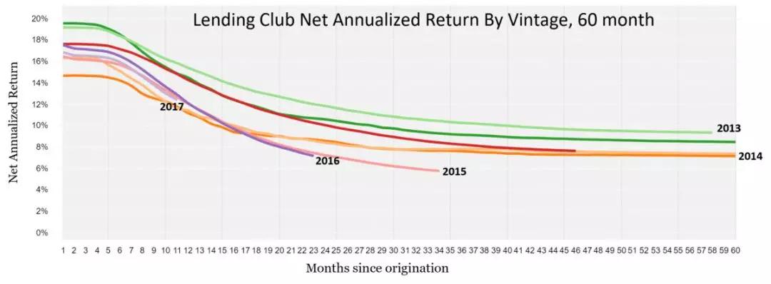 Lending Club贷款的年化回报率近5年每年的回报逐步减少。