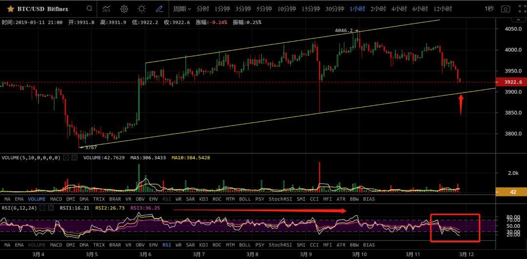 再看下1小时图,短期内的大饼走在这样的趋势通道内,币价与指标也有一定的背离,老铁们也可以以趋势通道作为操作的参考点位,把止损控制的小一些,更保险一些,当然如果币价触碰到下方趋势线,反身向上,对应的指标也会走出底背离,两项一结合,也可作为进入的较好的位置。