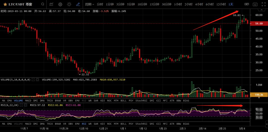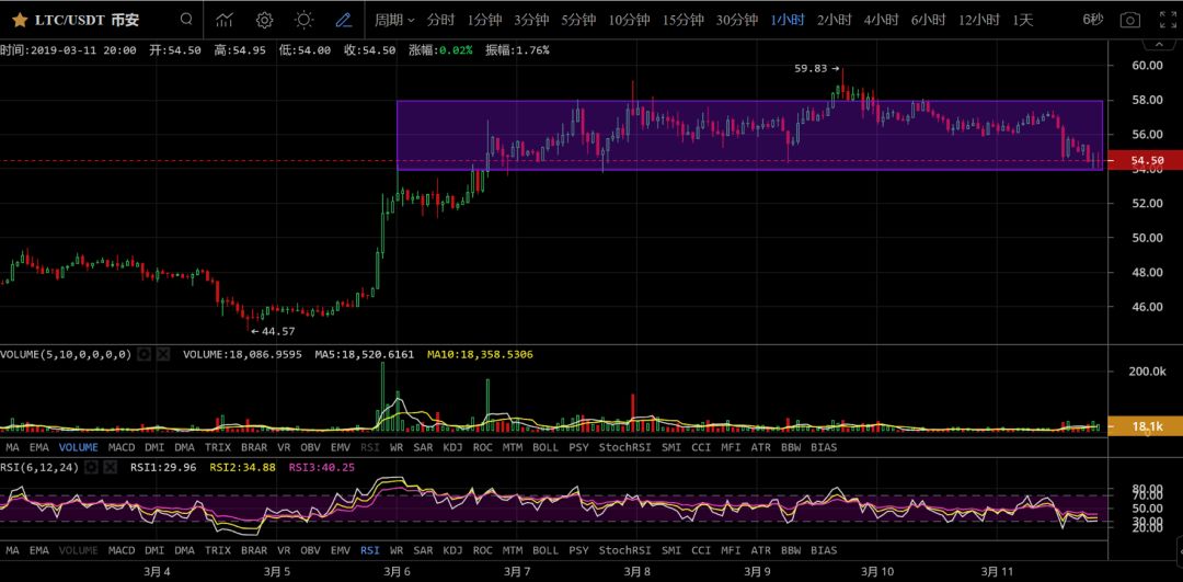 LTC/USDT现价54.5,日线图,莱特币这波涨幅不俗,对得起市场对他的期望,只是日线级别在指标上有些许走弱,所以在持币的同时要有警惕的思维,带着止损,及时锁住利润。