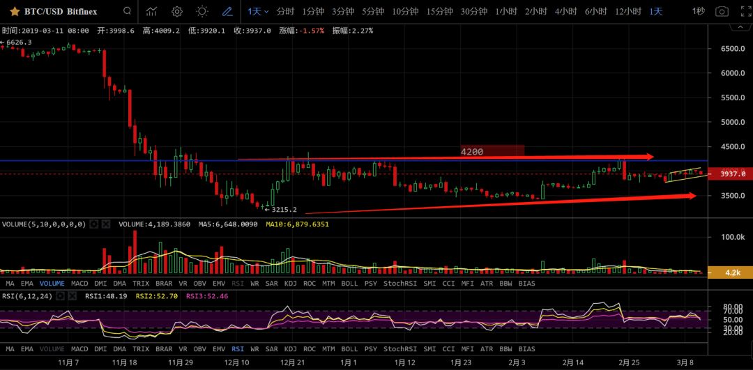 BTC当前点位3932,先来看下日线图,一个大大的W底目前走了出来,相信老铁们都希望后续的行情走出来,证明这个就是真正的W底,行情走到现在低点也在不断抬高,只是上方4200点位也比较有效,短期没有破了这关键个点位,所以说成是W底为时过早,这是日线级别的局势,大局一定要把握。