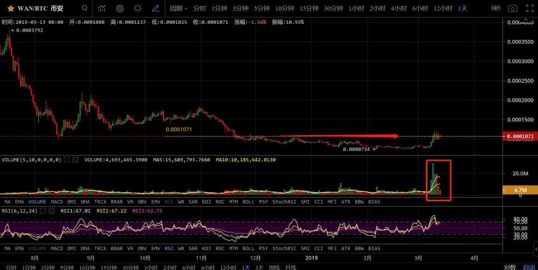 WAN/BTC现价0.0001069,这货经过一段时间低位整理,近期量能有所放大,目前的币价涨幅不大,而且目前走到前期小平台,这个可以关注下,一旦突破,应该会有机会,短线有所回落,不急于入,等价稳。