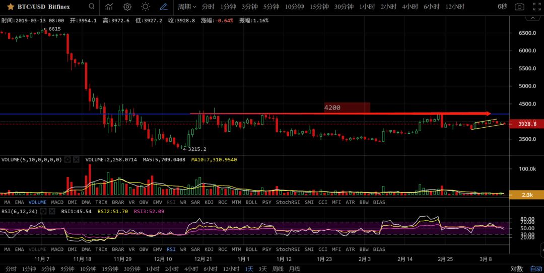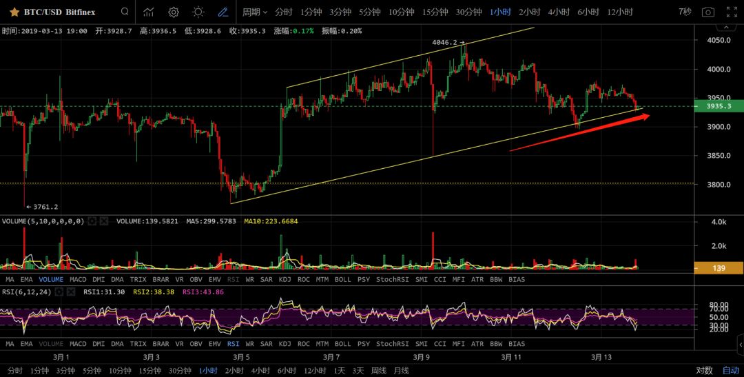 BTC当前点位3925,日线图趋势没有改变,目前的位置还是以震荡为主,冲破4200才是趋势的逆转。在4200之下都可以在日线级别之下找机会小仓位操作。