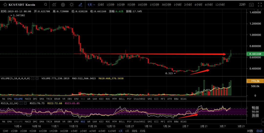 KCS/USDT现价0.661,日线级别,老铁在群中没少说这个币,关注有一段时间了,币价从最低点走上来的走势比较典型,相对来说抓这种行情抓的相对靠谱一些,这波涨幅比较给力,目前日线级别走到前高点,短线会遇阻回落,等这波小抛压过后,根据抛压的情况后续再入。