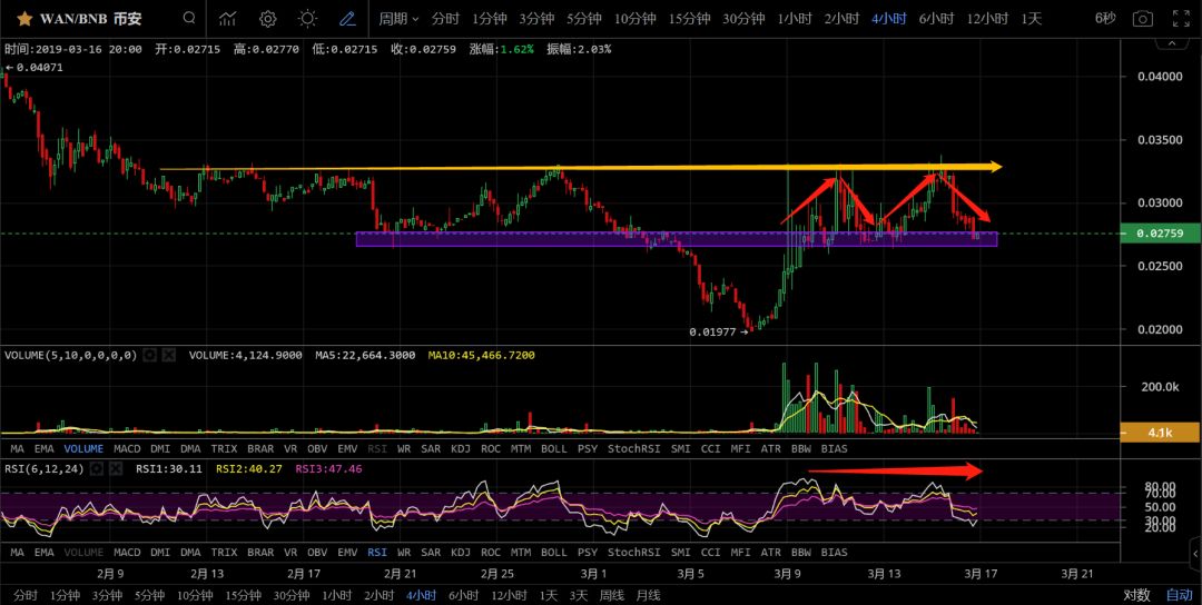 WAN/BNB现价0.0276,WAN4小时级别走出一个大大的M头,目前走到M头的颈线位,能否突破也是后市的一个指示,跌破颈线位还是暂时就不要持仓了,若能反向向上,后市还有冲破M头的希望。