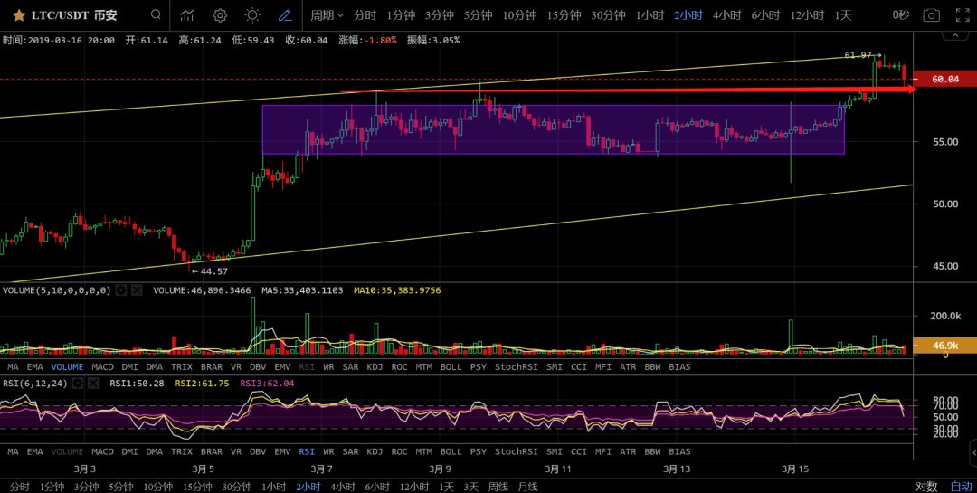 LTC/USDT现价60,莱特突破震荡区间,最高走到61.9,莱特的这波上涨仍在之前的上涨趋势通道内,遇高有所回落,这波不破59,问题不大,可以拿住。