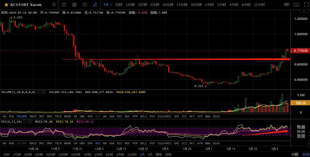 KCS/USDT现价0.779,前天的推文种提到:KCS在突破前期高点时需要磨一阵也属正常,没有放量,抛压不大,市场有信心,后续就有希望还有好表现。所以这波突破之后KCS走出10%的涨幅,目前的位置到点位1.00之间的压力位并不密集,上涨过程中的小回调会有的,抛压应该不大,所以持仓的不急于抛售,可以再拿一拿,除非遇到大局有变。