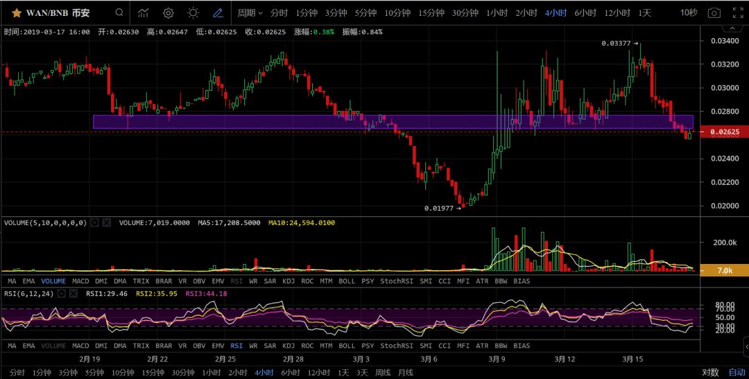 WAN/BNB现价0.0262,1小时级别,昨天给的颈线位今天被破了,量能虽然不大,但是跌破颈线位就是短线出仓的信号,看好WAN的老铁可以先出仓观望,等再有合适的进仓点或者再回到颈线只是再看。