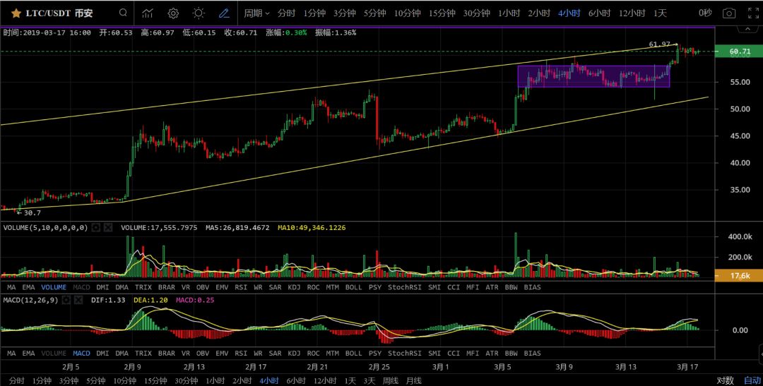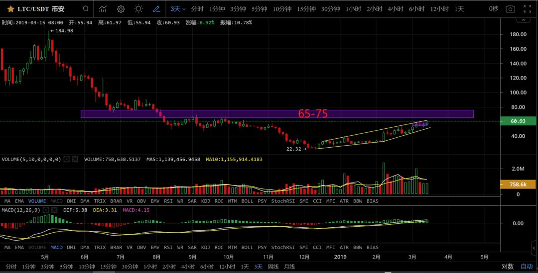 LTC/USDT现价60.7,看下3日级别,莱特的这波上涨走势非常漂亮,抛压也不大,而上方大概在65-75这个区间内筹码不多,所以莱特要是走入这个区间,后续的走势更会顺畅。