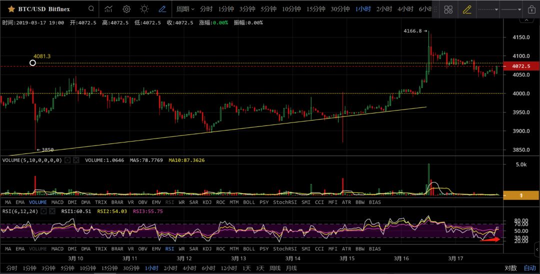 大级别的点位没有变,趋势依旧,上方4200点位有比较明显的压力位,所以向上遇阻需要磨一磨是正常的,而目前的位置,2小时级别看指标走的还不错,突破图中点位往4200还有的走。