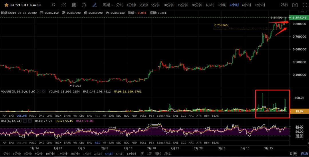 KCS/USDT现价0.849,昨天的推文种提到:目前的位置到点位1.00之间的压力位并不密集,上涨过程中的小回调会有的,抛压应该不大,所以持仓的不急于抛售,可以再拿一拿,除非遇到大局有变。今天走出不错的涨幅,短线的老铁可以把止损点提到0.81。