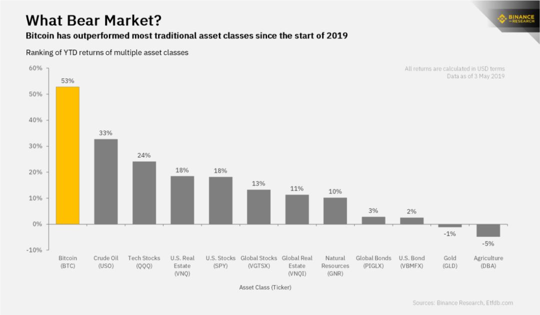 自2019年算起,截止5月3日,BTC收益率已经达到53%。相比之下,原油涨幅为33%,科技股涨幅24%,陷入衰退的美国房地产市场和标准普尔500指数涨幅仅18%。