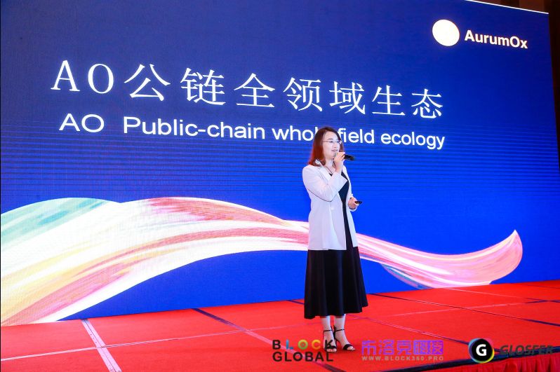 首先登场的是新加坡GGE基金会中国区负责人刘晓敏,她向会场嘉宾详细介绍了AO公链。AO生态以AO高速公链为基础,打造“黄金稳定通证+全球黄金交易平台+全球区块链银行+全球房地产交易所”区块链全领域生态。