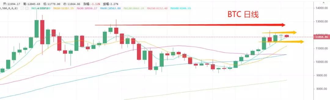 BTC:昨天晚上回落到支撑位附近,凌晨一波拉升又逼近12000点,这种上上下下的走势就是标准的震荡,而且是属于方向向上的偏强势的震荡,震荡区间为11400-12300,目前5日均线的方向向上,我倾向于还会往上突破震荡区间的高点,到时候观察突破的力度,如果是力度不济的假突破,要提防冲高动作之后形成阶段性高点,这种走法是格外要小心的,力度强劲,则将挑战13200。操作上可以在中枢震荡的前低前高附近,有止跌止涨迹象进行高抛低吸,中线就守着成本或者11500这个关键点位,有效跌破该关键位置建议先减仓。其他主流币在BTC震荡过程中,跟跌不跟涨,近期不会有独立行情,喜欢主流币的就趁跌的时候低吸点底仓。