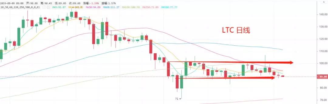 LTC:LTC整体上还是处在日线的横盘震荡中,目前缓慢下行中,稳健的需要看到日线大阳线再进场了。短期压力位94,短期支撑位88。