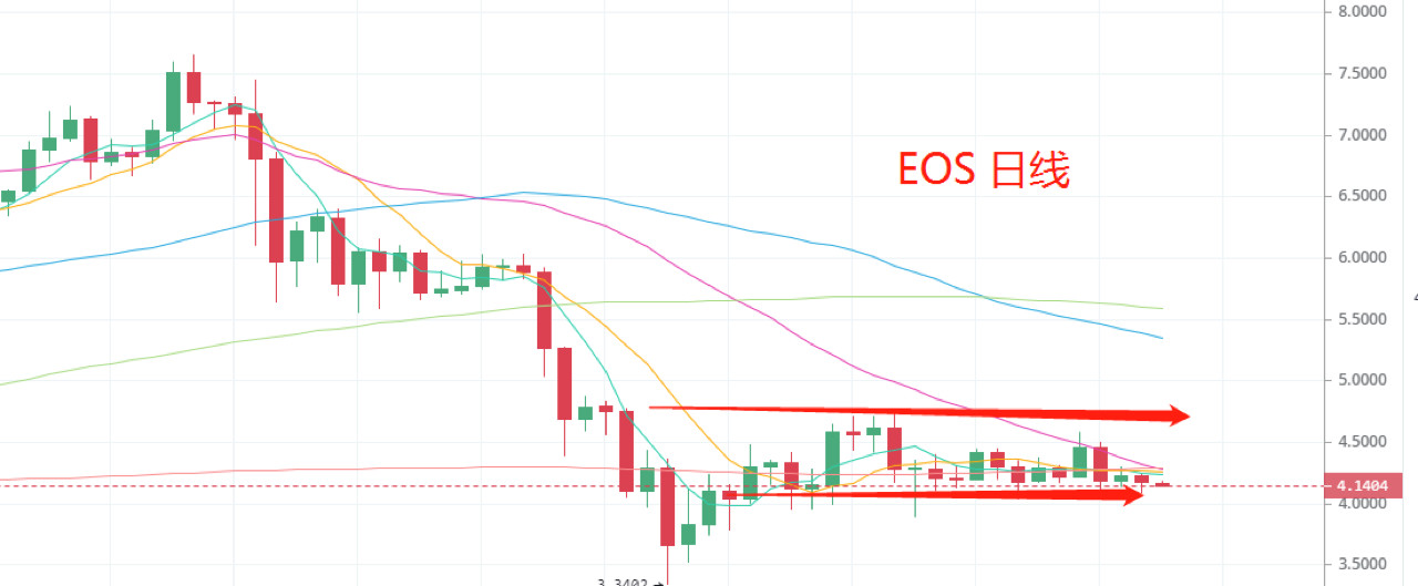 EOS:走势较弱,目前是日线上的横盘走势,要担心后续是否有破位下行的可能。短期压力位4.28,短期支撑位4.05。