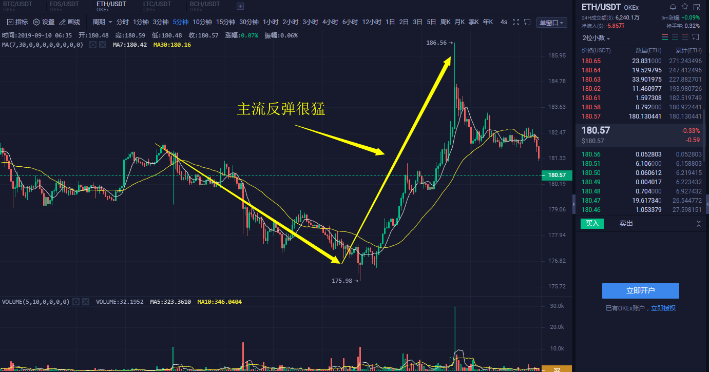 原本以为行情在10400附近止跌,没想到行情昨天日内继续来了小瀑布,最低到了10000附近,很多人吓到了。按照日线和小时线来看,无论怎么看都像是空头占优,但是实际上这种走势只能迷惑一般韭菜,对于我们来说,这种操作手法过于简单。深度洗盘是为了后市更好的拉升。只有吓倒一批人,庄家才会再度拉升。昨天的走势是大饼走势比较弱,但是柚子为首的主流币种还是比较强。盘中柚子现货拉升到3.96附近,相比较三天之前上涨幅度超过20%。应该说主流币种走出补涨走势完全是为了追上大饼的节奏,但是未来的行情我的预测是以柚子为首的币种将走出超越大饼的牛市。