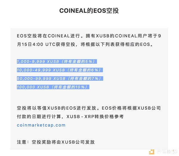当然,用户最终获得EOS或XRP的数量将由在 #DOBI# 或 #Coineal# 交易所内持有的#XUSB#数量决定。官方将会在9月15日下午4:00(UTC)准时进行快照,想要了解更多详情,可以访问下方的交易所官网: