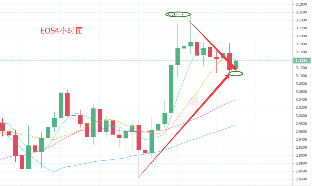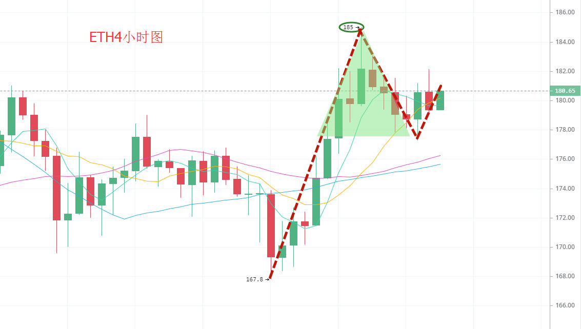 以太坊上涨后小幅回调,185点是日线较难突破的,还会向下调整。如果能够持续在180上方区间震荡,是比较好的信号,但是看指标回到下方的趋势依旧存在。