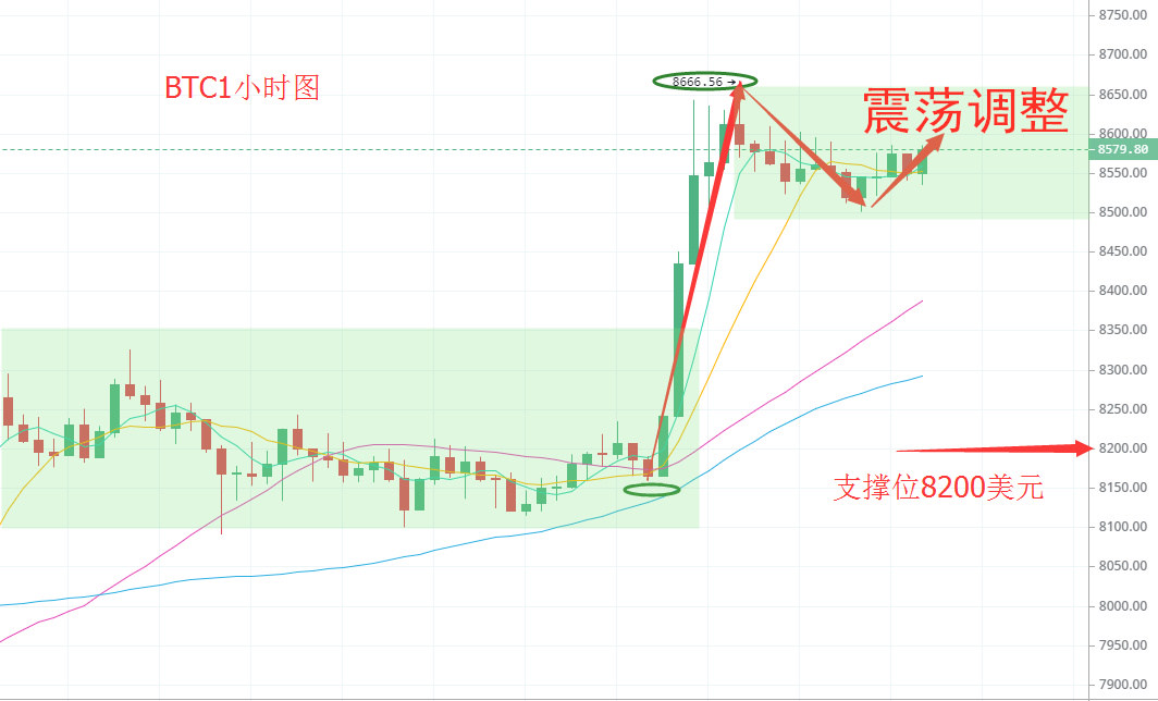 凌晨又一波拉升,行情来到8666美元,看来想突破8700的阻力位还需时间,早间盘面一直在8500附近震荡,从盘面看技术结构上当前多头略强,但整个格局还未发生大的改变,前期8600区间在试探,当前走势进入高位整理阶段,仍然具备上攻动能,随时可能形成二次突破,今日的突破能力不强,短期放量过大,我们着重需要关注日线级别中轨能否成功击穿,价格一旦上涨至8700那么整个形态将是一边倒,做多看9000一带无疑。反之近两日若是不能站稳其上方测压于下,那么调整也的预期也会出来。结合当前形态来看,区间以上移至8300-8700一带,大涨后有一个修正的过程,所以不太建议急着做多,更多的是高位空。我们着重关注技术价格的测压支撑。