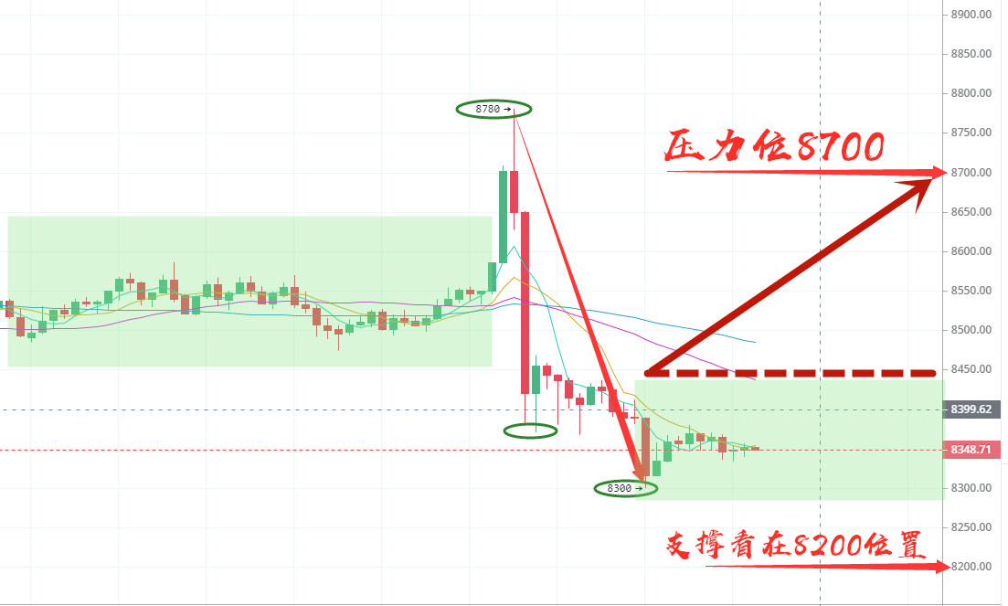 操作方面:今日压力位8700,支撑位8200。操作上建议8450附近直接做多,目标看8700一带。