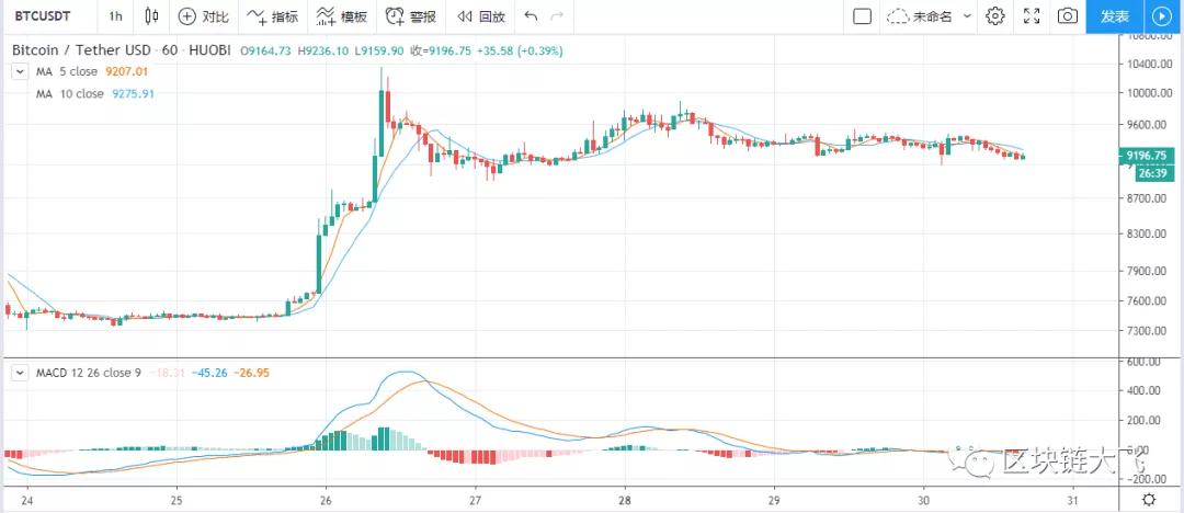 今天整体行情处于震荡状态,日K线上已经走出了下跌通道,量能分布在多头,和5日均线重合,等币价站稳后,走势大概率会出现一波反弹。短线MACD形成死叉,下跌趋势已经形成。大飞觉得币价回调整理过后,可能继续向上突破10000,跌破8800过后就要注意止损,操作上持币观望为主。压力位:9900,支撑位:8800