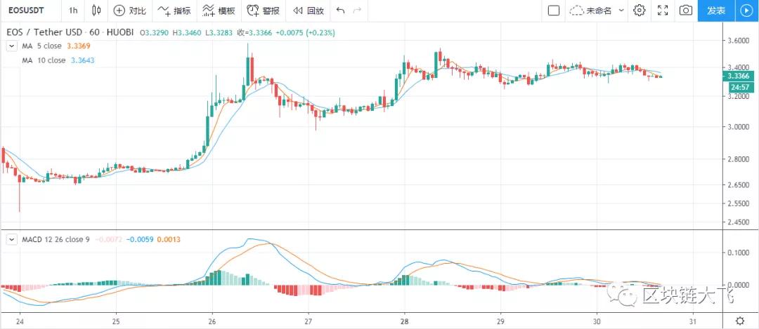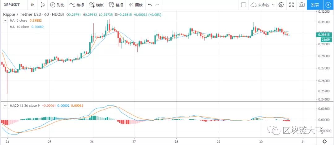 走势逐渐增强,但整体来看仍处于震荡状态,其交易量达到所有数字货币的第一位,与其价格低廉有很大关系,尽管XRP前面行情不如人意,但其入场门槛低,翻倍空间相对较大,后面要继续关注,进场的可以继续持有。压力位:0.31,支撑位:0.28