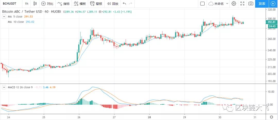 BCH在利好作用下,上涨幅度远大于大饼,今天再次拉升失败,现在短线回调,小时线KDJ逐渐形成底部金叉。长线趋势向上,继续看好11月行情,介于其短期内热度不减,大飞认为大概率震荡调整后继续拉升,可以小仓进场博反弹,持有的继续持有观望。压力位:307,支撑位:280