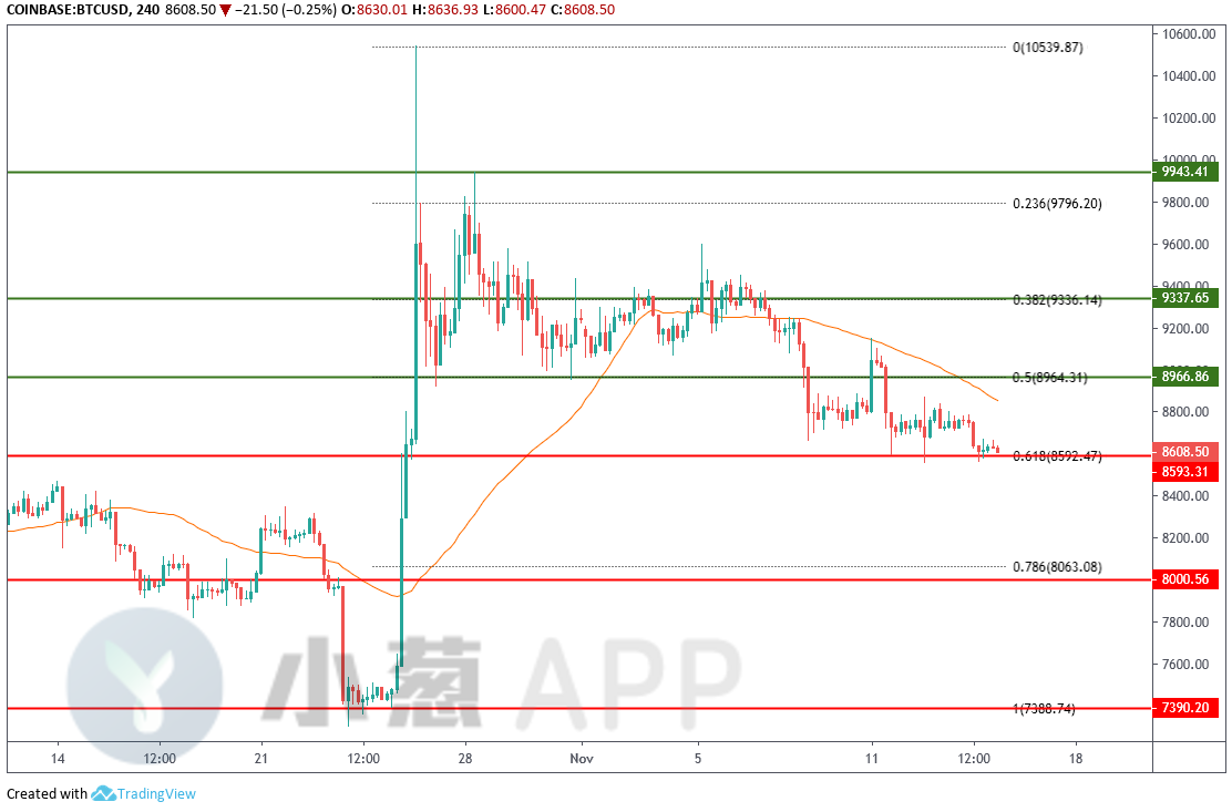 如引语所述,BTC在下跌触及8600整数一线后行情突然丧失了“动力”,目前价格已经在8600上方极窄的区间内横向拉锯了足足5根4小时K线的时间。受这种持续弱势震荡带动,该币种4小时50周期均线在向下跌穿前期上涨波段回调半分位后,目前已经正式下压至8800整数附近,这意味着BTC短线震荡所处的第一区间实际上已经收窄到了200美元水平,考虑到价格在本周初重新跌回至8970以下后就再也未能实现对于该阻力的反弹触及,随着上方第一阻力持续下压,未来一段时间内BTC的动能很可能会进一步减弱。