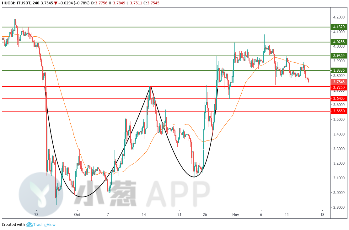 简单关注一下主流币种中隔夜领跌的HT。在10月份的一波深跌以及随后的反弹修正过程中,HT走成了一个比较清晰的双底结构,不过在价格站至这一底部结构颈线阻力转化支撑上方后,由于对于该支撑的回踩确认迟迟未能给出,因此HT一直没有走出有效的发力上涨。不过随着最近一周多时间里的回调行情走出,目前该币种正式回到了上述颈线支撑,即3.7250一线支撑附近,短期内该位置附近的多空争夺结果料将成为决定该币种下一步发力方向的关键所在。