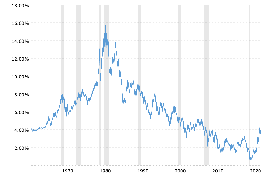 1963年至今美国10年期国债收益率变动情况。收益率越高意味着债券价格越低。来源:macrotrends.net