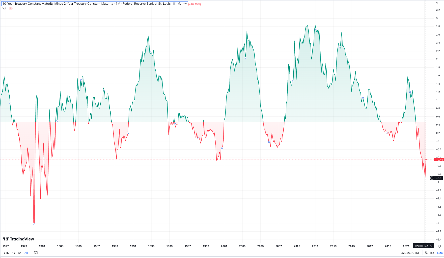 1977年至今美国10年期国债收益率与2年期国债收益率差变动情况。来源:Tradingview