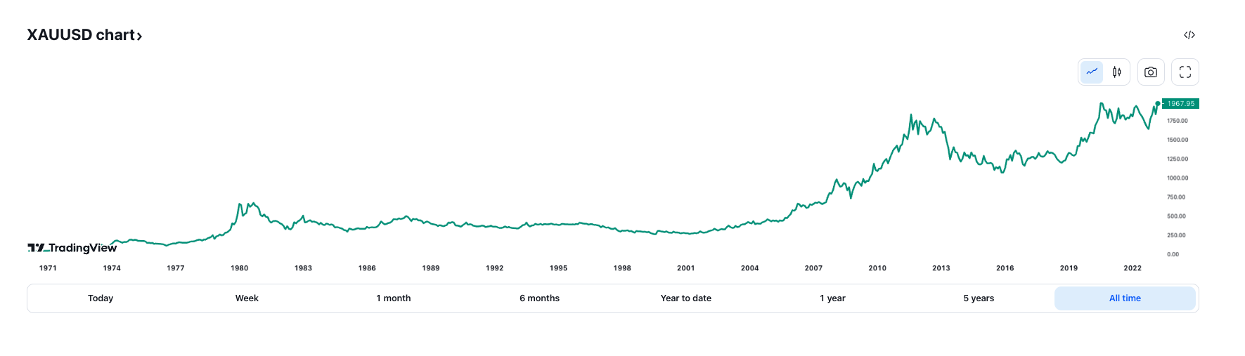 1970年代至今黄金价格变动情况。来源:Tradingview