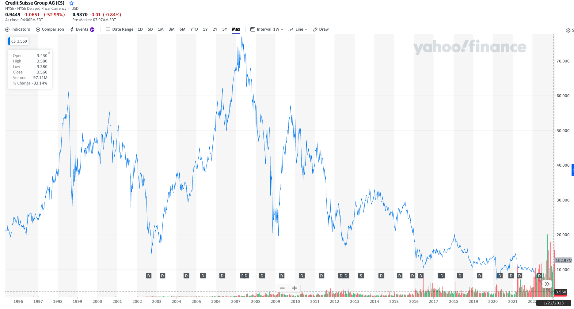 瑞士信贷(Credit Suisse)股价变动情况。来源: Yahoo Finance