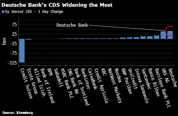 德意志银行(Deutsche Bank AG) 信用违约互换(CDS)价差变动情况。来源: Bloomberg