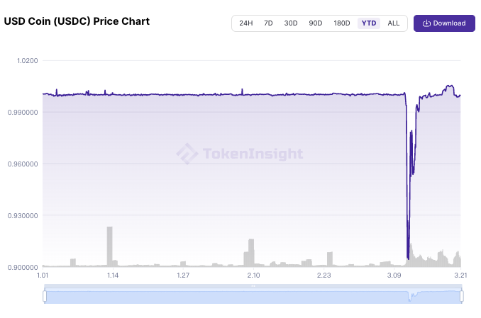 在传统市场银行业危机扩散的当下,加密市场亦难以“独善其身”。硅谷银行的倒闭使得 USDC 受到了波及,其价格一度因为恐慌性抛售下跌12%,与美元脱锚;即使最终 Circle 成功从硅谷银行中取出了所有存款,投资者对于 USDC 的谨慎态度并未因此而减少,USDC 的价格尚未恢复稳定。
