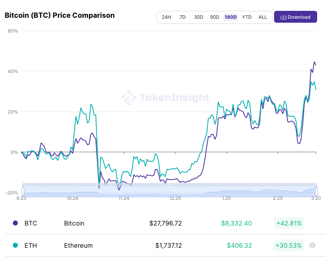 BTC 与 ETH 价格涨跌幅变动情况。来源: TokenInsight