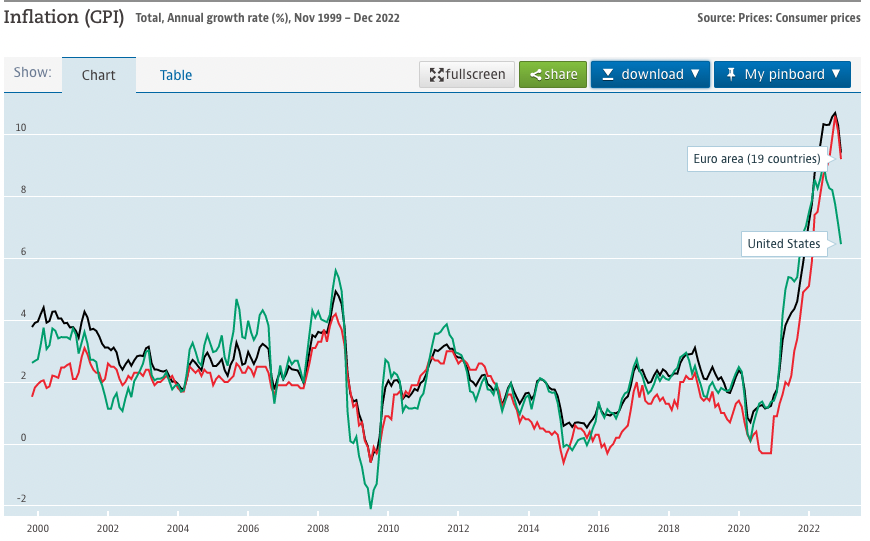2000年至今美国与欧洲 CPI 数据变动情况。来源:OECD