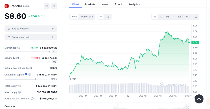 截至目前,RNDR 代币的市场价格为 $8.60,在过去 24 小时内,RNDR 代币的价格上涨了 17.42%。市值为 $3,282,880,123,位于所有加密货币中排名第 31 位。