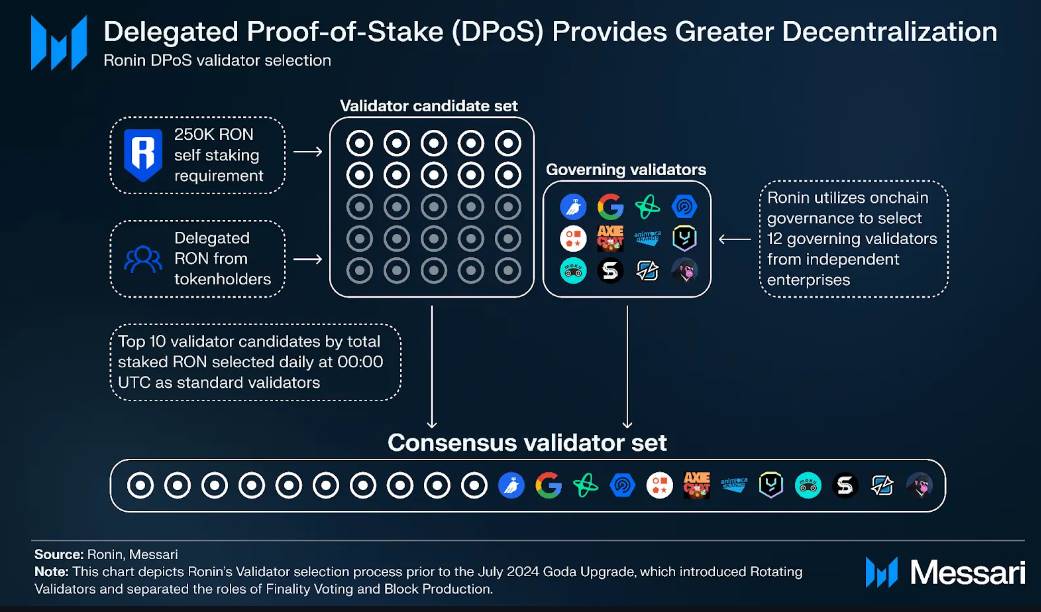 2024 年 7 月,Ronin 启动了 Goda 升级,以使所有活跃的验证者都能为共识机制做出贡献并获得奖励。在之前的 DPoS 版本下,只有排名前 10 位的验证者候选人才能为共识机制做出贡献并获得奖励,从而激励代币持有者将 RON 委托给这些排名靠前的候选人以继续获得奖励。因此,委托给其他验证者的人数会减少,而且由于质押要求较高,新的验证者候选人不愿意参与。因此,之前的 DPoS 版本通过将委托的 RON 集中在排名前 10 位的验证者候选人中来集中网络。