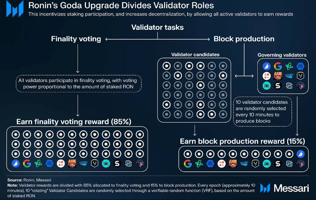 Goda 升级版通过分离最终投票和区块生产任务解决了这个问题。所有验证者都参与最终投票,获得 85% 的奖励,投票权与质押的 RON 数量成正比。对于区块生产,Ronin 引入了轮换验证者来获得剩余的 15% 的奖励。每个时期(大约 10 分钟),都会随机选择 10 位验证者候选人来生产区块。此选择使用可验证随机函数 (VRF),该函数考虑每个验证者候选人的总 RON。12 位管理验证者也会生产区块,但不会轮换。
