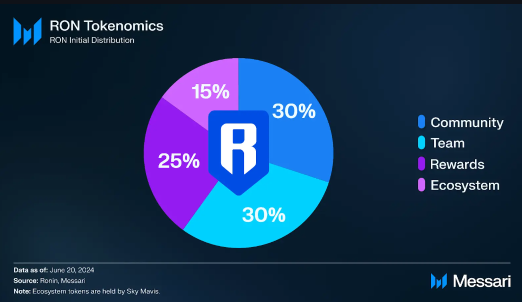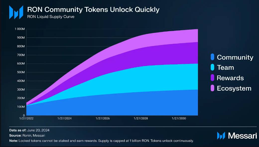 初始代币供应分为四个主要分配:30% 分配给社区、30% 分配给团队、25% 分配给质押奖励、15% 分配给生态系统基金。RON 代币是连续解锁的,而不是区块解锁。解锁于 2022 年 1 月 27 日开始,如果每个解锁的代币都发行,则可在 108 个月或 9 年后解锁最大供应量。