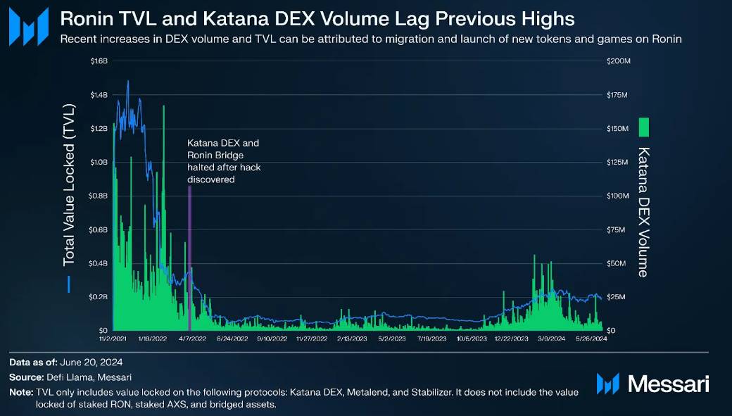 Katana 的 TVL 在 2021 年 12 月 4 日达到历史最高点 14.9 亿美元,DEX 交易量在 2022 年 2 月 10 日达到 1.7577 亿美元的峰值。这与 Axie Infinity 的巅峰时期相吻合,当时 AXS 和 SLP 是交易量很大的资产。在桥梁黑客攻击之后,Katana 上的 TVL 大幅下降。2022 年 5 月 12 日,TVL 跌破 1 亿美元并一直保持在该水平,直到 2023 年 4 月 14 日,它短暂地升至 1 亿美元以上。2023 年 12 月 4 日,Katana 上的 TVL 再次超过 1 亿美元,此后一直保持在该水平之上。TVL 和 DEX 交易量的近期增长主要是由于 Katana 上引入了新的代币。到 2024 年为止,Ronin 已通过引入 PIXEL、BANANA、YGG、APRS、ANIMA 和 PHPC 将 Katana 上支持的资产数量增加了一倍,达到 12 个。