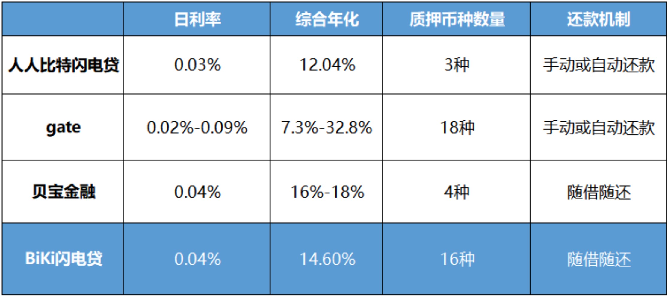 目前市场上,介入借贷市场的主要玩家是钱包和交易所,下面将选取市场上最热门的借贷产品:人人比特闪电贷、gate、贝宝金融,以及今年重磅上线的BiKi闪电贷。通过日利率、综合年化、质押币种数量、还款机制这4大维度进行分析,以便用户做出更好的选择。