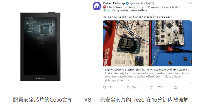 为了进一步保护私钥安全,Ledger,Cobo金库,Coldcard,Imkey等产品使用了安全芯片存储私钥。安全芯片就是可信任平台模块,是一个可独立进行密钥生成、加解密的装置,内部拥有独立的处理器和存储单元,可存储密钥和特征数据,为电脑提供加密和安全认证服务。用安全芯片进行加密,密钥被存储在硬件中,被窃的数据无法解密,从而保护商业隐私和数据安全。反之,没有使用安全芯片的Trezor等产品频频发生私钥被导出的漏洞,令人唏嘘。