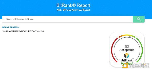 2月11日,Plus Token 旁氏骗局欺诈者将1.2万比特币从一个钱包转移到另一个钱包,该地址与其他一些地址在其他区块链浏览器中被标记了出来。5 月15日,我们将这个已经绑定到Plus Token骗局的比特币地址粘贴到Bitrank 里,但结果他们给出的风险评分结果为52分,属于“可接受”范围(如下图所示)。根据Bitrank服务分析结果,与这个欺诈地址相关联的其他地址也得出了相同的分数,即被认为是“可接受”的。