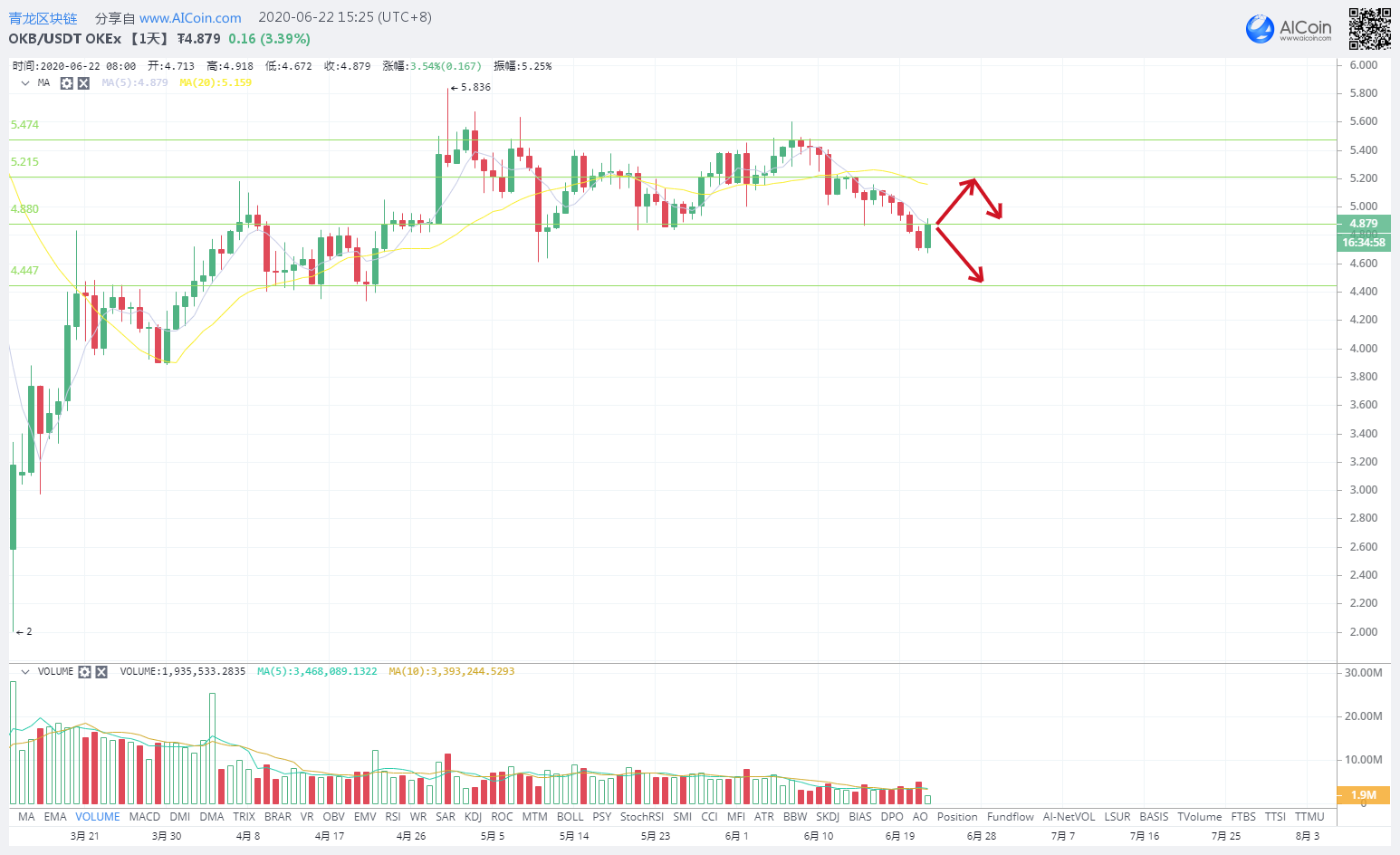 OKB,日线4.8U的支撑位现在变成了压力位,突破4.8U后将继续上行冲刺20日均线的压力位5.2U,若不能够突破4.8U则就会回归到4.4U-4.8U的震荡区间,由于20日均线和5日均线已经呈现了下行压制趋势,所以,短期内不要做多,支撑位4.8/4.4U,压力位5.2/5.4U,注意做多风险。
