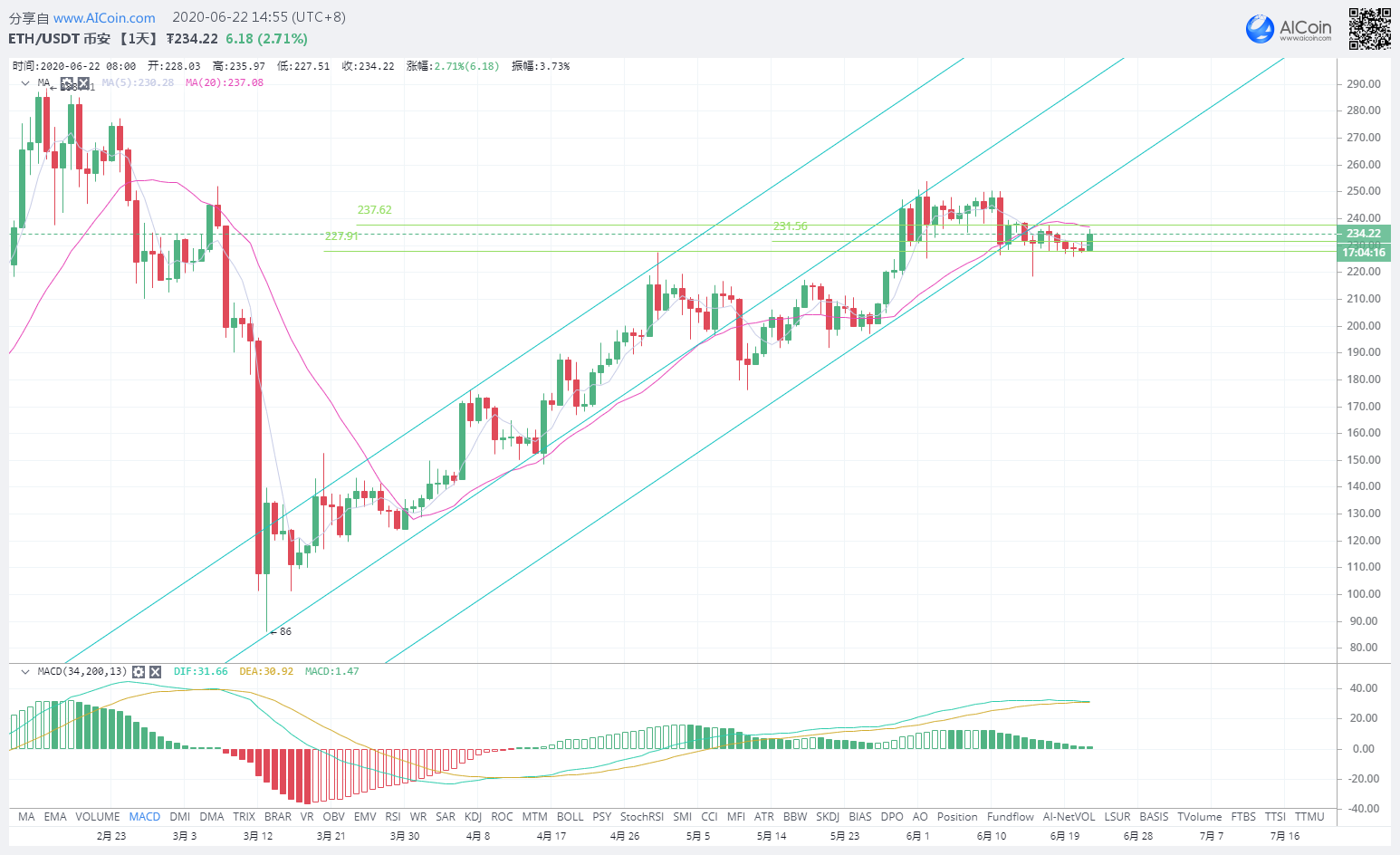 ETH,24H级别指标,当前K线在5日均线231U上方运行,同时237U是日线上升通道的下轨位置同时也是20日均线的压制位置,短期内已经回踩到了231U支撑点位并且站稳了该位置,今天会进一步冲击237U的压力位,不破则会回踩修整,支撑位:231.5U/227.9U,压力位:237.6U。