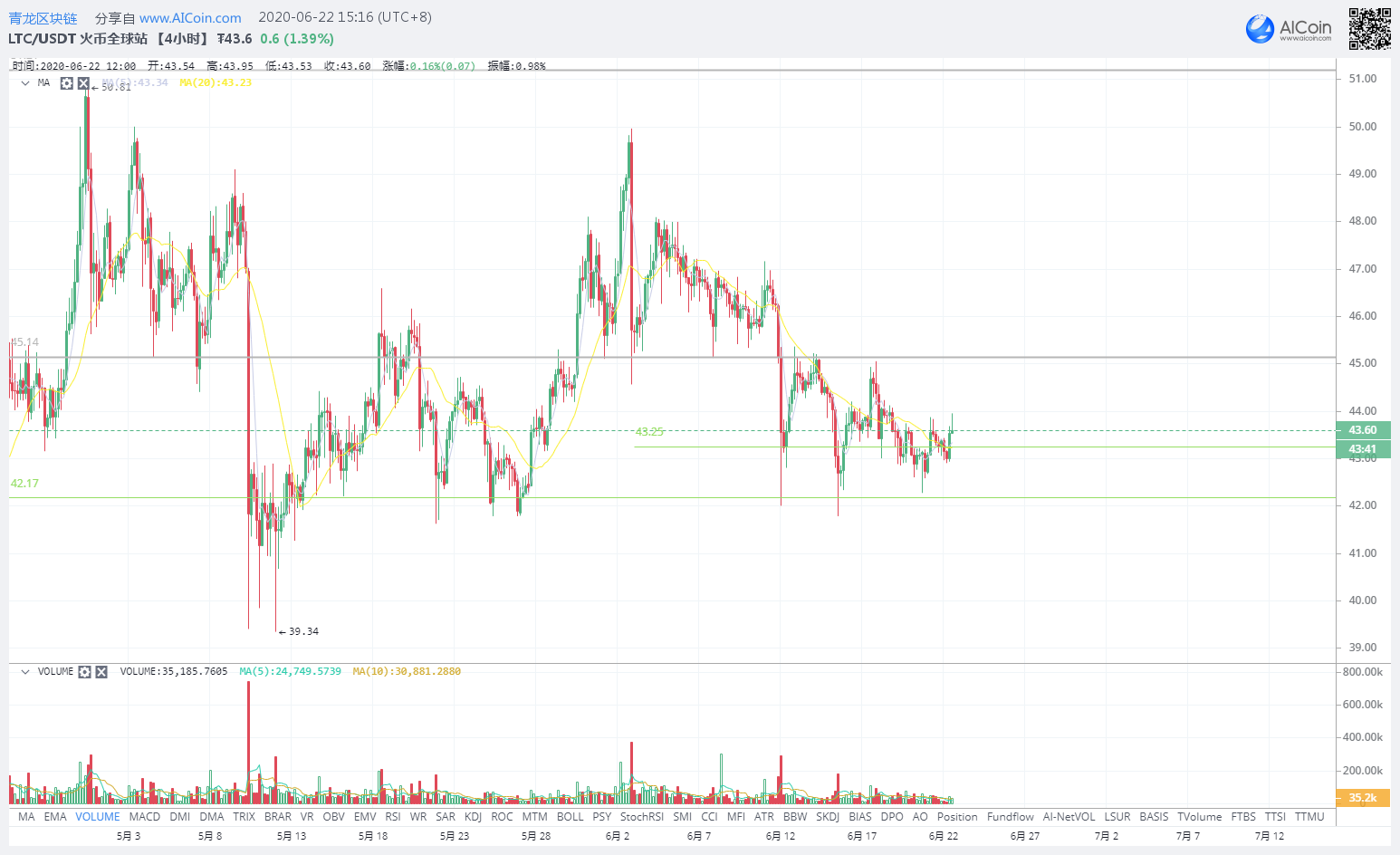 LTC,日线20日均线走平并由下行的趋势且受到45.09U的压制,虽然突破了5日均线43.25U但趋势线依然向下,短期内可以在震荡区间高抛低吸,支撑位42.17U/43.25U,压力位45.14U。